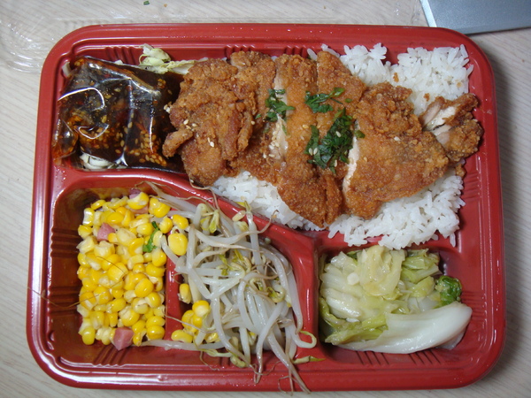 這是泰式椒麻雞便當,配菜是店員夾的,醬汁是淋在椒麻雞上的,飯是泰國香米,味道真得不錯!