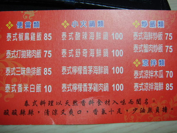 說真得高雄能外帶的泰式便當好像不多,大部份都要在店裡享用,像我們家中有很小的小朋友就不太方便去吃。這時同事介紹的泰式便當剛好可以派上用場,就在這個禮拜日決定去買來當午餐。應該是一家剛開不久的店,位於文橫路上,中午去買時客人是陸陸續續上門,外場大概有四、五個人在服務,除了外帶之外大部份都是到店裡用餐,環境還算乾淨。