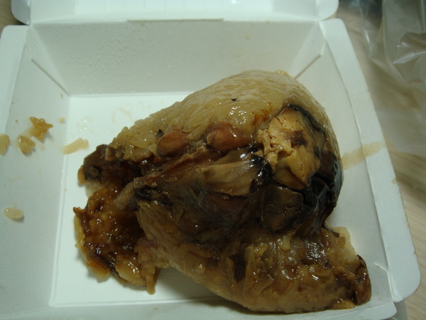 哇!肉粽還是那麼大顆,口感好黏好Q,一顆是35元,附沾醬(醬油膏、辣椒膏),別看那一小包不起眼的辣椒膏,還蠻辣的。